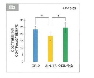 この3種類の食事をマウスに4週間食べさせた時の大腸粘膜の制御性T細胞(CD4+ Foxp3+細胞)の割合を解析しました。その結果、栄養バランスの悪いAIN-76食の場合バランスの良いCE-2食と比べて制御性T細胞の割合が低下していましたが、クロレラ食では制御性T細胞の低下が抑制されていました。